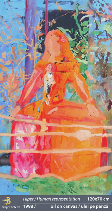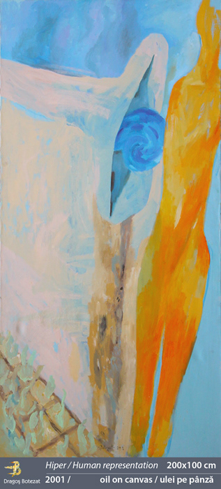 Hiper came as a semi-concilliation with the earthly. Man and the landmarks in human life intertwined in the still active space of the “Mirage”. Man is a witness, is involved, but still in his quiet corner. He is the reference to pure principles. He is placed with his back turned in order to induce the idea of opening, but also to suggest a mask that hides another opening - space in its artistic dimension. In time the head without a portrait stood out by the force of pure unchanged eruption. This is how I came from Art-Life to Interior-Exterior. My Hiper-Man traced the first lines of my future humanity.
