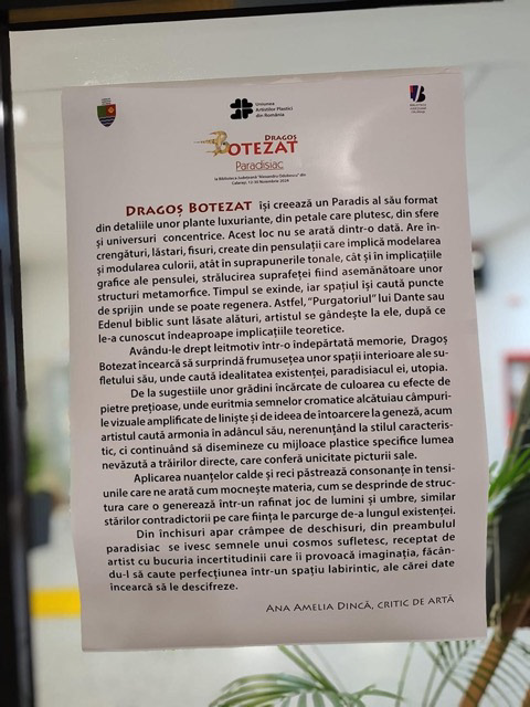 Dragoș Botezat își creează un Paradis al său format din detaliile unor plante luxuriante, din petale care plutesc, din sfere și universuri concentrice. Acest loc nu se arată dintr-o dată. Are încrengături, lăstari, fisuri, create din pensulații care implică modelarea și modularea culorii, atât în suprapunerile tonale, cât și în implicațiile grafice ale pensulei, strălucirea suprafeței fiind asemănătoare unor structuri metamorfice. Timpul se exinde, iar spațiul își caută puncte de sprijin unde se poate regenera. Astfel, “Purgatoriul” lui Dante sau Edenul biblic sunt lăsate alături, artistul se gândește la ele, după ce le-a cunoscut îndeaproape implicațiile teoretice.