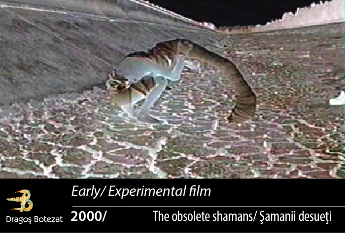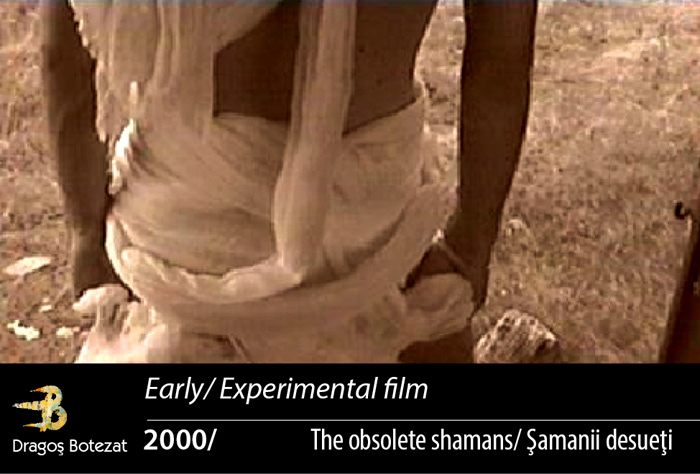 The limits of a work instrument can be investigated directly through the work, when you do it by tracing the first steps in the universe of the video camera, this being the path Dragoş Botezat walked at the beginnings of his experimenting in this field. What does using traditional means and obtaining a new result, a significant difference mean? It means “trying” both colours and darkness, going away from day light, from the visible, entering the world of “Obsolete Shamans”. Having passed gates and thresholds you went on a path of “inversion”where black is white and light is dark. Here, on the edge of things, everything is situated in a nuance of translucid blue-grey.The canvas folds and branched cilinders that crown the shamans’ heads extend and dissipate the encephalon. The skull and its vital “holes” are sealed, covered in new thatches in permanent mutation.The camera and cameraman first perceive the phrenetic rotations and vibrations of the beginning and then go into a new stability, a stage of progressive sedimentation.The skin, the “widest” human sensory organ, that damp and puny clothing is for Dragoş Botezat both a priviledged place where his phantasms are projected and the canvas where the reflections of a telluric world converge.The spaces where the « shamans » are circumscribe their rituals in a post-nuclear universe where urbanicity is defined by corroded walls and concrete enclosures of sport centers abandoned by cyclop populations. Hardly could you tell whether “the obsolete shamans” heal anybody with their radioactive potions; however, they did not forget their calling in a “disenchanted”, that is dis-illusioned and dis-covered world; they heal each other. Man becomes artist when he changes things and this calling of hi sis almost compulsive, urging him to “impregnate” and saturate the surrounding surfaces, be they in the barren rocky valleys of the mountains taking up the shape of bluish glyphs, or on the sea shore where the human body an dits wodden prolongations lie stretched out among hanging ropes.Not last the music, the sound underlayer is invested with special importance by Dragoş Botezat, it carries him throughout his cinematic exploration. The image cannot be subjected to sound; in this case because both support each other, filling pauses and constraining them to speak.